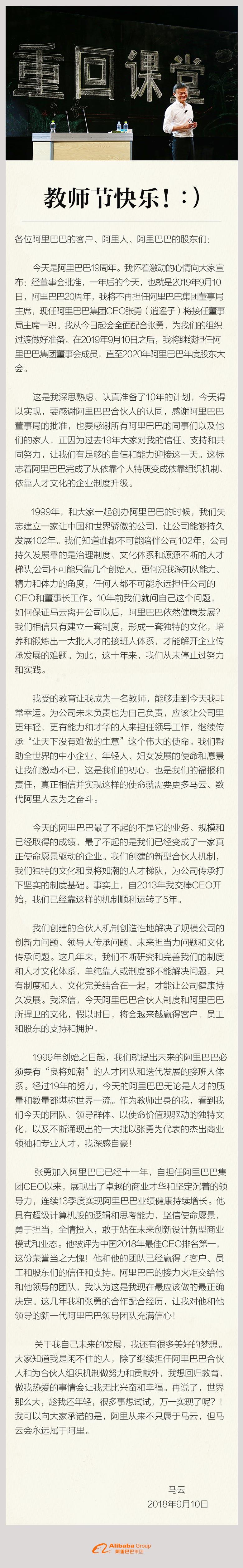一年后的今天,即2019年9月10日,他將不再擔(dān)任集團(tuán)董事局主席,屆時(shí)由現(xiàn)任集團(tuán)CEO張勇接任。